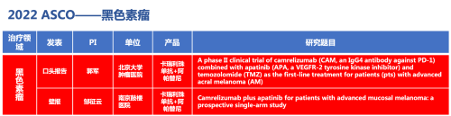 其一为进入2022 ASCO大会口头报告环节郭军教授等开展的单中心、单臂II期研究(NCT04397770),研究采用“双艾”联合注射用替莫唑胺一线治疗晚期肢端黑色素瘤。