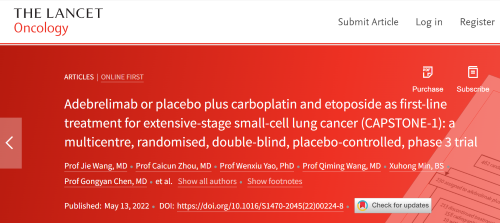 北京时间2022年5月14日,伟德国际医药自主研发的PD-L1抑制剂阿得贝利单抗治疗广泛期小细胞肺癌的III期临床研究(CAPSTONE-1研究)成果正式全文在线发表于国际权威学术期刊《柳叶刀·肿瘤学》(《THE LANCET Oncology》,影响因子41.316)。CAPSTONE-1研究结果显示,阿得贝利单抗联合化疗一线治疗广泛期小细胞肺癌相较于安慰剂联合化疗可以显著延长患者总生存期至15.3个月[1],刷新现有免疫药物一线治疗广泛期小细胞肺癌的总生存纪录[2]。