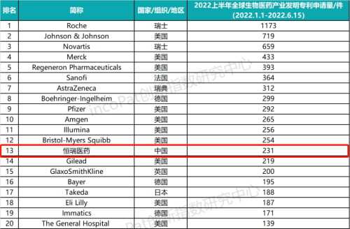 专利是药企最有价值的资产之一,是企业发展的基石,对做原创创新的企业尤为重要。全球专利数据库incoPat创新指数研究中心对2022年1月1日至2022年6月15日公开的全球生物医药产业发明专利申请数量进行统计排名,生物医药产业专利涉及生物技术药、基因工程药物、疫苗、诊断试剂、微生态制剂、血液制品等技术领域。入榜企业/医院主要来自13个国家、组织或地区,罗氏、强生、诺华分别位列前三,伟德国际医药(231件)排名第13位,领跑中国药企。