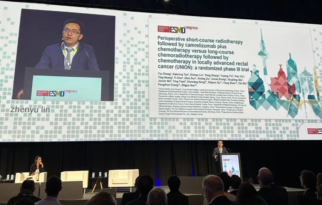 10月21日,伟德国际医药创新药卡瑞利珠单抗的一项研究“新辅助短程放疗序贯卡瑞利珠单抗联合化疗对比长程放化疗序贯化疗治疗局部晚期直肠癌”随机对照Ⅲ期试验(UNION)亮相2023 ESMO大会优选口头报告现场。该研究由华中科技大学同济医学院附属协和医院张涛教授、陶凯雄教授担任主要研究者,华中科技大学同济医学院附属协和医院林振宇教授在大会现场报告了该重磅研究的结果1。此项研究是全球首个评估短程放疗序贯免疫治疗联合化疗治疗局部晚期直肠癌的Ⅲ期研究,已达到主要终点病理完全缓解(pCR),有望为直肠癌患者的治疗提供新策略。
