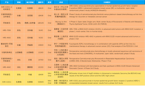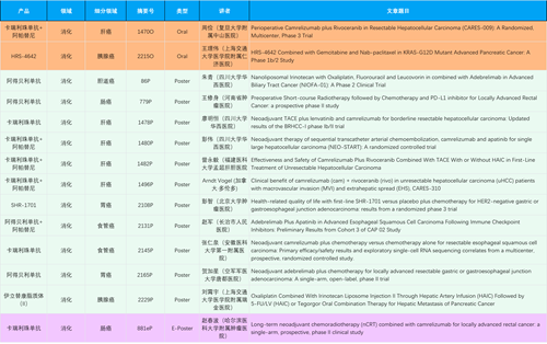 在消化系统肿瘤领域,伟德国际产品相关研究共入选2项口头报告、11项壁报和1项电子壁报,共14项研究。除卡瑞利珠单抗和阿帕替尼外,还有4篇阿得贝利单抗治疗消化系统肿瘤研究入选。HRS-4642、瑞拉芙普-α注射液(SHR-1701)等在研创新产品也有相应研究亮相。另有1项伊立替康脂质体(II)用于胰腺癌治疗的研究入选壁报。